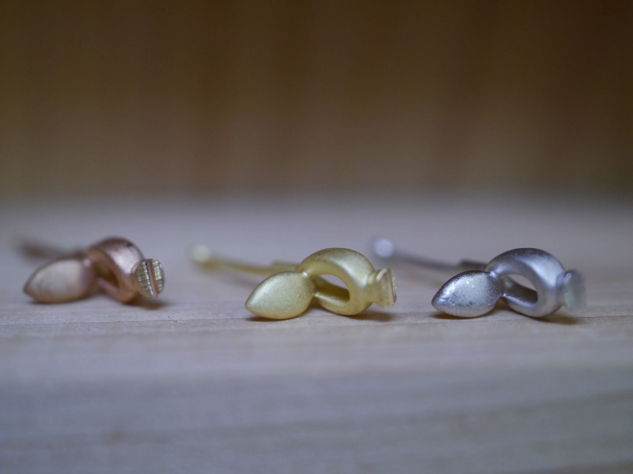 ジュエりんごはいくつか作ってみようということになっていたので、中の人その1:宝飾師がシルバーで原型を作り、それを元にゴム型を取っています。ゴム型を作るとその後の金属は選べますので、K10も3色展開で、オプションでK18(イエロー・ピンク)やプラチナにもできました。
